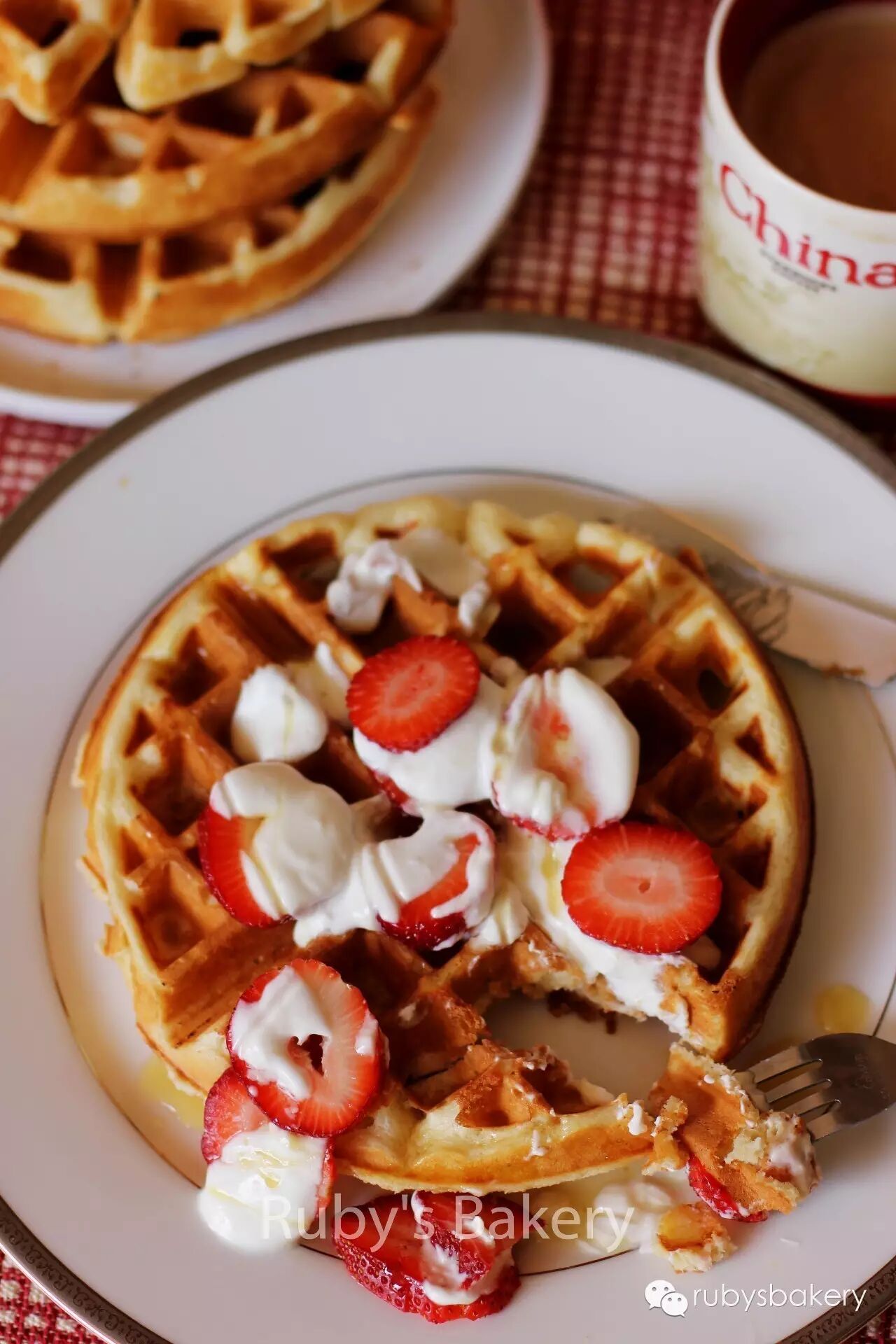 担心热量的,可以少淋一些蜂蜜或糖浆(syrup),但是一定要淋才好吃哦。每咬一口,华夫饼的格子里都有甜甜的糖浆,加上爽口的水果,甜而不腻。