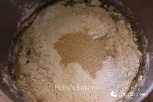 1.上面所有材料按顺序混合(酵母放面粉上面,避免和糖,盐接触),容器表面盖上保鲜膜,冰箱冷藏一晚(或者室温下放置1小时)