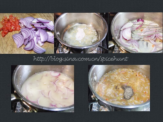 2. 然后开始准备酱汁,把洋葱切丝,番茄切碎。在一口小锅里,热上黄油和橄榄油,加入面粉然后不断搅拌至面粉变金黄色,加入洋葱继续煸炒至洋葱变软后加入鸡汤和番茄丁,如果你喜欢酱汁更稀一些,可以加点水,继续搅拌,煮滚。加入酱油,番茄酱和黑胡椒调味,继续煮至浓稠即可。