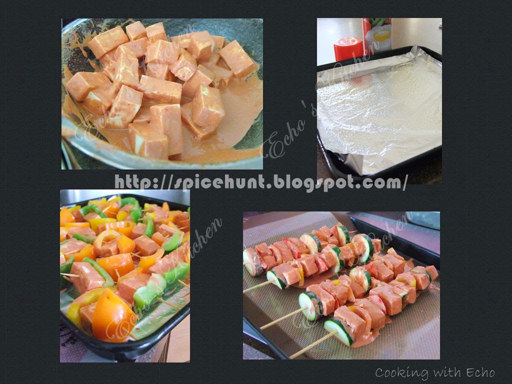3. 烤箱预热至375 F (190 C), 把一个烤盘喷或抹上一层油,豆腐串摆在烤盘上,入烤箱烤8-10分钟。 然后把烤箱转成Broil,豆腐串翻面,继续broil5-8分钟或上色。