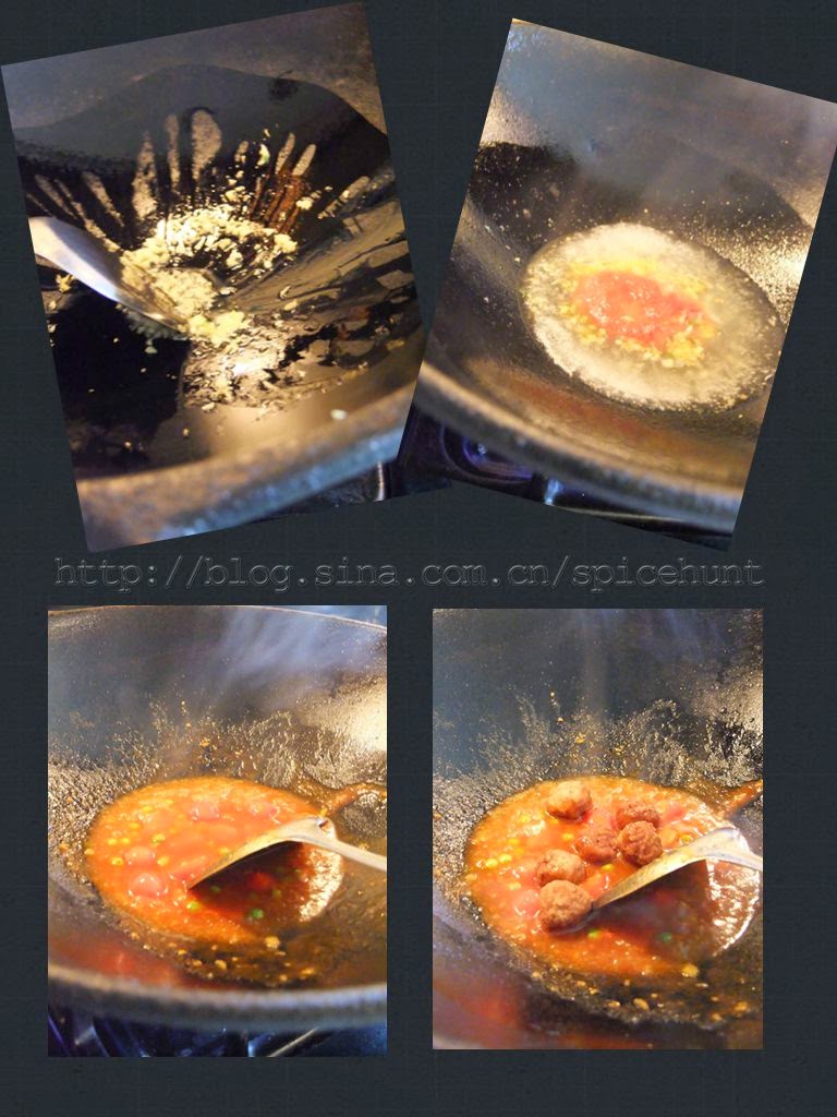 5. 倒入半杯水和1/4杯的番茄酱,混匀煮滚,加入番茄,胡萝卜和青豆,煮1-2分钟。酱汁开始变浓稠的时候加入肉丸子翻匀。试试味道,如有需要,可以适量加糖或盐。