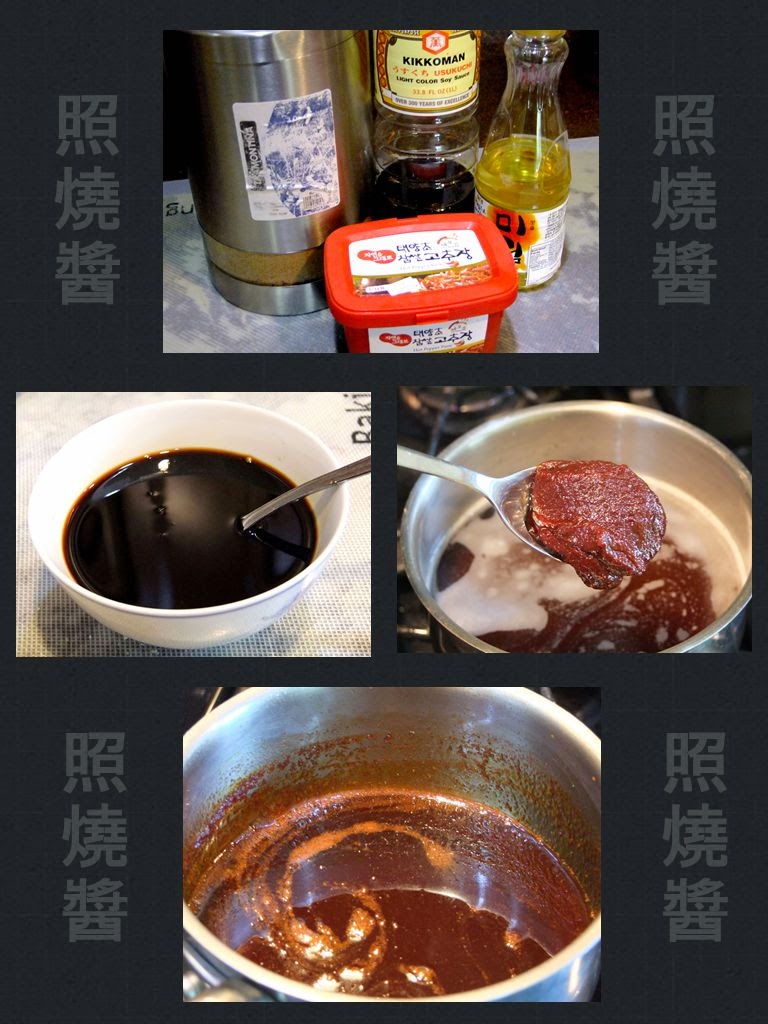 1. 把所有照烧酱材料倒入一口小锅里用打蛋器拌勻,先大火煮滚然后转中小火熬制大约10分钟,然后加入2大匙的韩国辣椒酱,再熬煮 5-10分钟,至浓稠。熄火冷却备用。