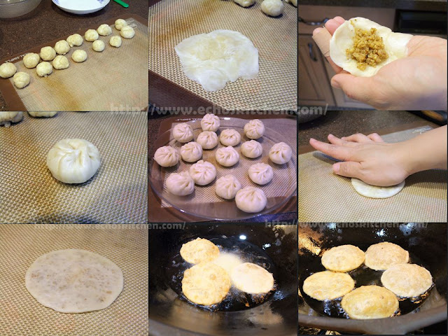 5. 把面团分成15等份,擀开,边上擀薄。然后加上一小勺的豆馅,捏成包子形,把所有面团都包好。