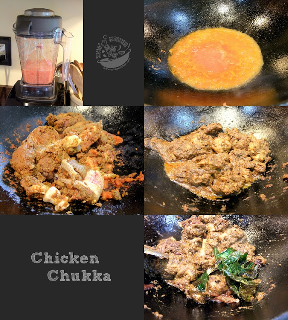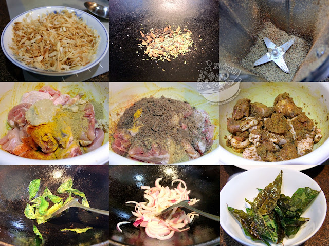 3. 把鸡肉清理好后切块。把椰丝粉、香料粉、芫荽粉、辣椒粉、黄姜粉、姜蒜蓉和盐腌制鸡肉块至少2-3个小时,腌一个晚上更好。