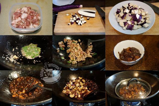2. 茄子茄丁后微波炉里转3分钟(也可以入油锅炸一下)。