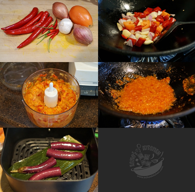 4. 开始做蘸茄子,把茄子洗净对半切开,抹点食油用小烤箱或气炸锅375度(190 C) 烤软,大约需要10-15分钟。或把茄子入微波炉高火转3分钟至变软。