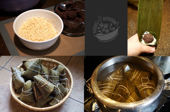 今年端午节我裹了好些肉粽和朋友们分享,冰箱里还有一大盒我自己熬制的红豆沙,裹粽子还剩下一些糯米和粽叶,就随手裹了两串的豆沙碱水粽,真是香甜美味,颜色也特别漂亮!
