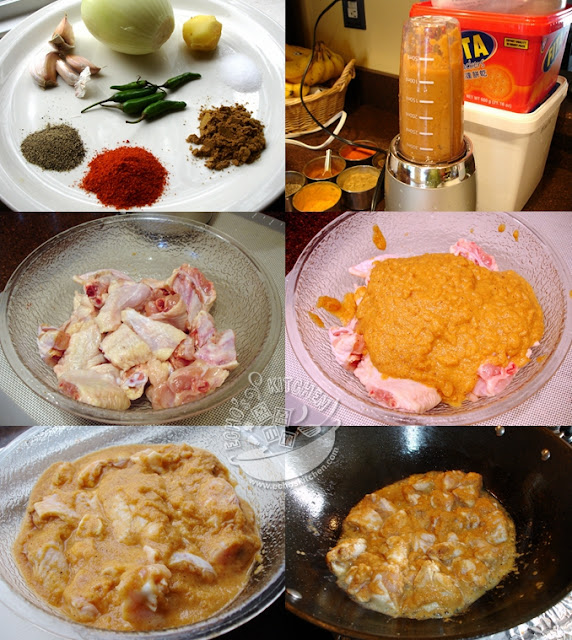 2. 把鸡肉洗净切块后加入搅拌好的香料糊腌上2-3个小时,能放冰箱腌过夜更好。