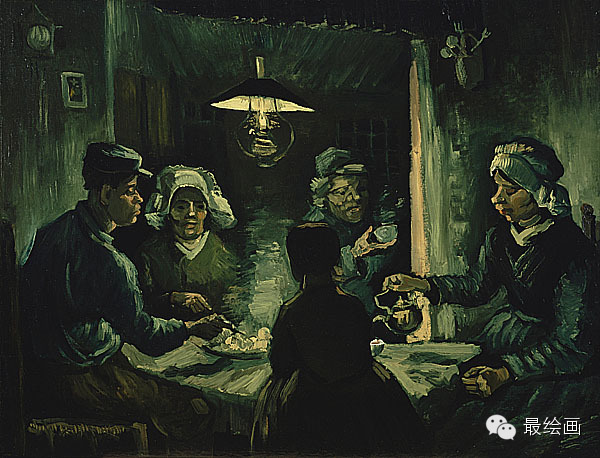 画上一家农人围坐在狭小的桌子前,屋子矮小简陋,在昏暗的煤油灯下,一家人在辛勤劳动,之后所享用的晚餐仅仅是几颗土豆。画中寄托了梵高对穷苦人的深挚感情。画画以后的梵高觉得世间的一切景物都是美的。