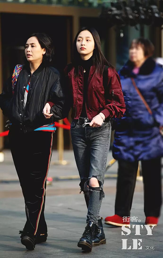 极光红短款夹克,黑色破洞牛仔裤,双肩包,马丁靴, 好好看的一个小姐姐