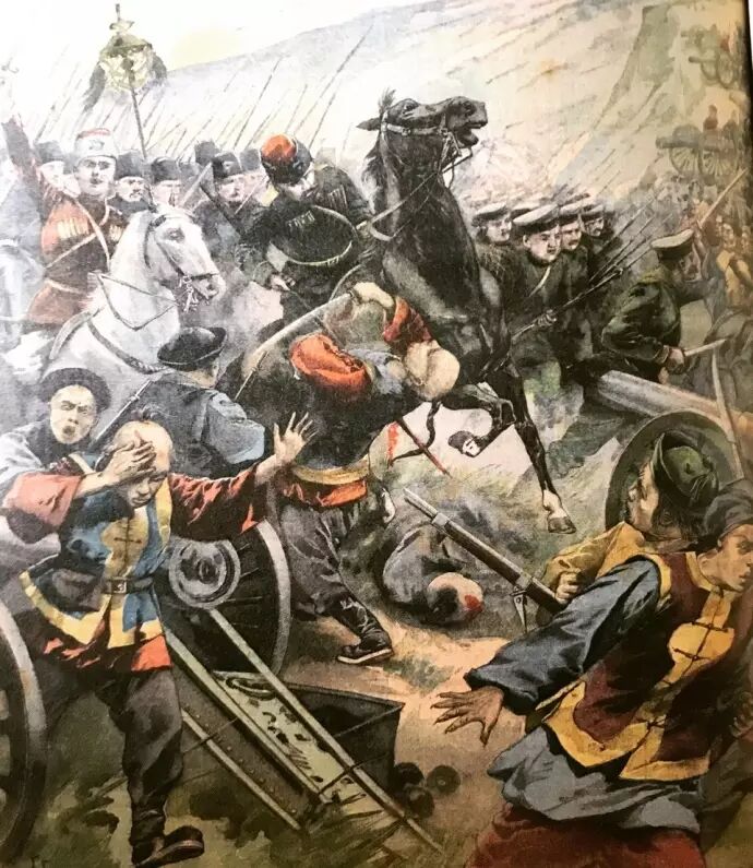 1900年8月5日《小巴黎人报》插图描绘了俄军侵略东北的景象,在满洲俄军击溃了一支清朝炮兵队。