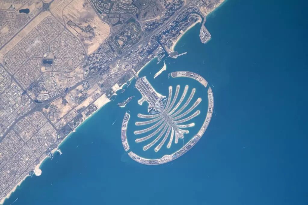 【30】迪拜,太空中看到的棕榈群岛看上去很酷,下图近日由宇航员Shane Kimbrough拍摄。