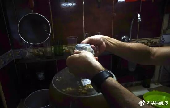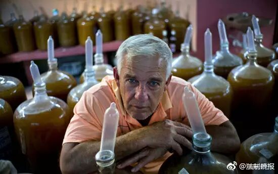 【35】【古巴男子用避孕套酿酒 当套子完全膨胀即发酵完成】近日,古巴哈瓦那,古巴酿酒师老Orestes Estevez与一坛坛瓶口套着避孕套的红酒坛。老Orestes酿造葡萄酒的主要原料是古巴葡萄,但也往里添加了各种热带的水果蔬菜。老Orestes和家人一道在酒坛里装上葡萄、生姜和芙蓉花,然后再将避孕套套在坛口,就开始了不同寻常的酿酒过程。当避孕套完全膨胀之后,Orestes知道发酵完成了,红酒也就酿得差不多了。