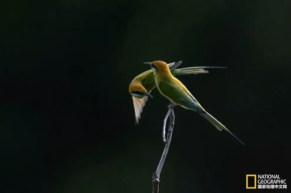 一只飞行中的蜂虎鸟向着另一只站在栖木上的同伴靠了过去。看看这完美利落的转身,堪称鸟界耍帅“扛把子”