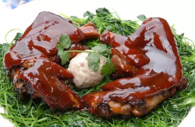 取猪蹄,作红烧处理,在底盘铺野菜作饰,一道“走在乡间的小路上”便出锅了。猪皮软糯,油而不腻。猪肉的沁香与野菜的爽口,一口咽下,整个人仿佛真的走在乡间。