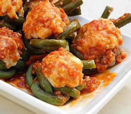 原料:长豆角10根,鸡胸脯4块,淀粉适量,葱花﹑番茄酱﹑盐﹑蒜瓣各适量。