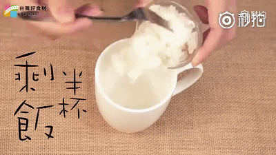 将头晚的剩饭倒入半杯,再加2大匙鲜牛奶,