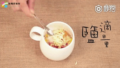 3.洒上适量的盐和胡椒!用勺子将杯子内所有食物充分打散搅拌均匀。