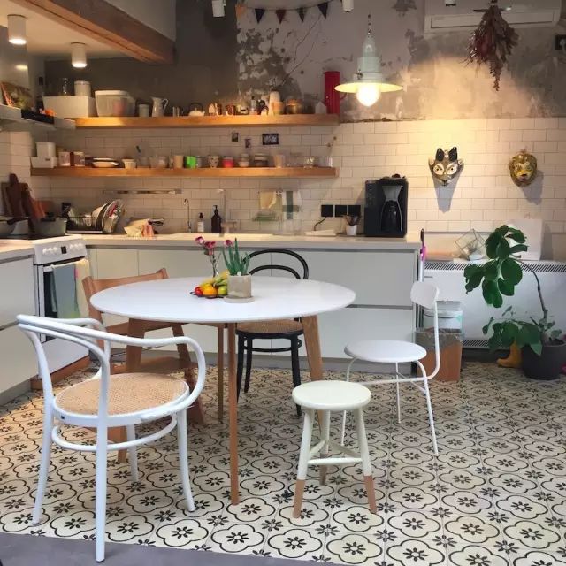 厨房的餐具、厨台、冰箱和墙壁几乎都是白色的,给人洁净清新的感觉,为了增添一些活泼的元素,还特意给之之在地上铺了花砖。
