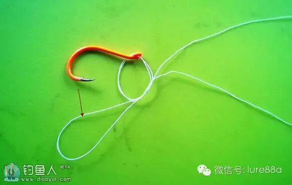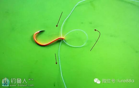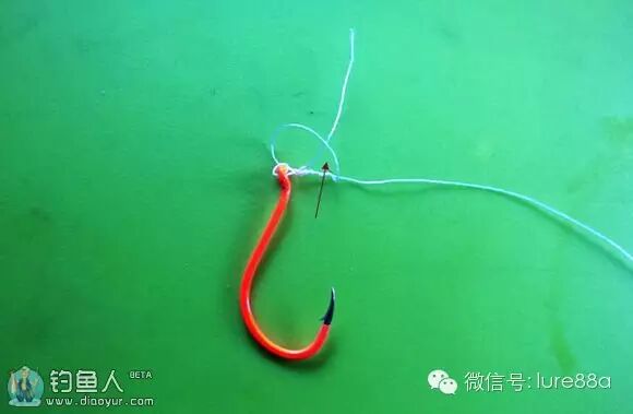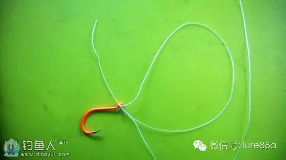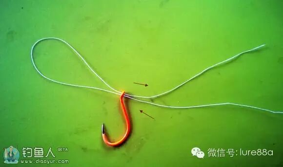 1.鱼线穿过鱼钩再穿回。
