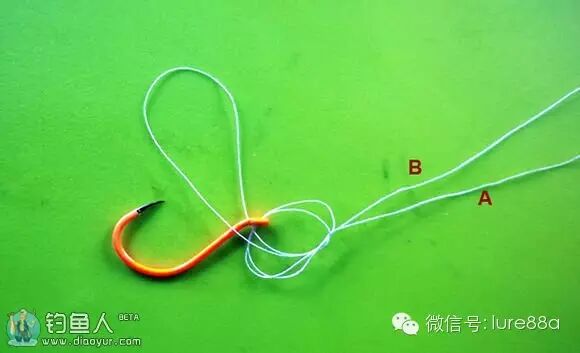 鱼钩穿过线的圈圈,并拉紧AB两侧