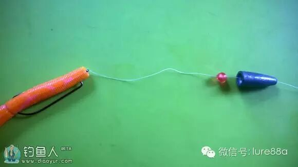 将挡珠放在距离鱼钩一段距离的地方,铅坠不能滑到鱼钩处,这是卡罗莱纳钓组,使用发放同德州钓组,抽动间隔更大,等待时间更长。