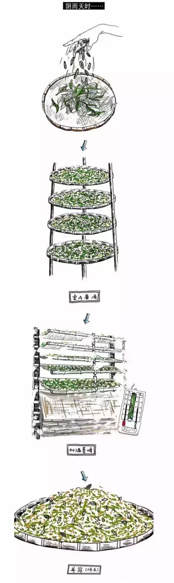 如果遇不良天气,使用复式萎凋方法,即室内萎凋与自然萎凋相结合,这就对茶师有更高要求。萎凋至九成干以上才完成整个萎凋过程,这时茶叶的含水率可能大大超过10%以上。