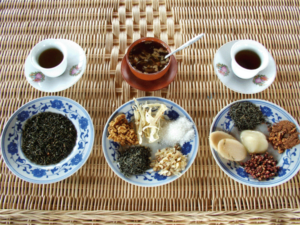 分三次用不同的配料泡茶,风味各异,概括为头苦二甜三回味,头道茶为苦茶,把茶叶放入小陶罐中用小火烤至微黄并有清香味时,再向茶罐内冲入沸水,泡成浓酽的茶汁倒人杯中饮用,此茶味浓且苦,故称苦茶。第二道茶为甜茶,它是和茶叶嫩芽和核桃仁、烤乳扇、冰糖蜜饯或者蜂蜜等用沸热的开水冲泡而成。此茶甜滋滋的,故称甜茶。第三道茶为回味茶,它是用茶叶嫩叶加生姜片、花椒、桂皮末、红糖等用滚烫的开水冲泡而成。