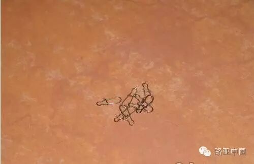 3、路亚钓法中使用的别针是用来连接路亚钓线和假饵的,为保证强度用一整根钢丝制成。如图所示,小圈的一段是用来连接路亚线,而大圈的那段是连接假饵上的连接环的。路亚别针属于低价消耗品,每次出钓前应准备足够的数量。本人建议不要用别针和连接环之类的东西,影响饵的配重,会影响饵的游泳姿态。