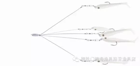 适用鱼只活性低及大范围搜寻时。子线大致上以30公分为基准,子线越长则泳形佳,晃饵收线次数少,但鱼讯传达较差;子线越短则反之,泳形较差,但鱼讯传递较好。此钓组以平拖方式为最佳晃饵技巧,采用泳型变化多以及尾部较大的软饵,最能发挥软饵本身游动的特色。