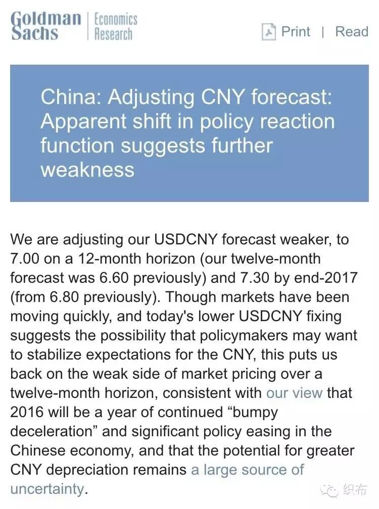 在报告中,高盛对此给出三个理由:1.政策制定者对汇率的控制减少,比如现在央行更愿意让货币贬值。2.近几个月央行强调贸易加权汇率的重要性。3.经济周期显示未来经济可能走弱。高盛依然认为“2016年贬值还将继续,并且中国会有重大的刺激经济政策。”