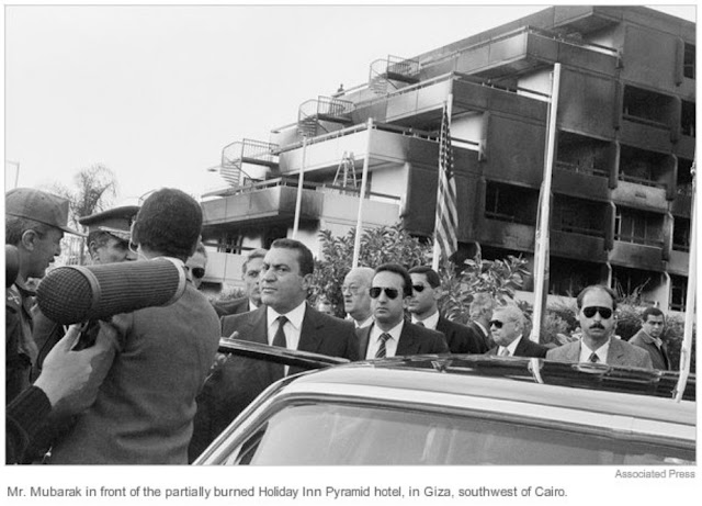1986年2月25日,穆巴拉克总统视察位于开罗南部的城市Gisa,背后是被发动骚乱的