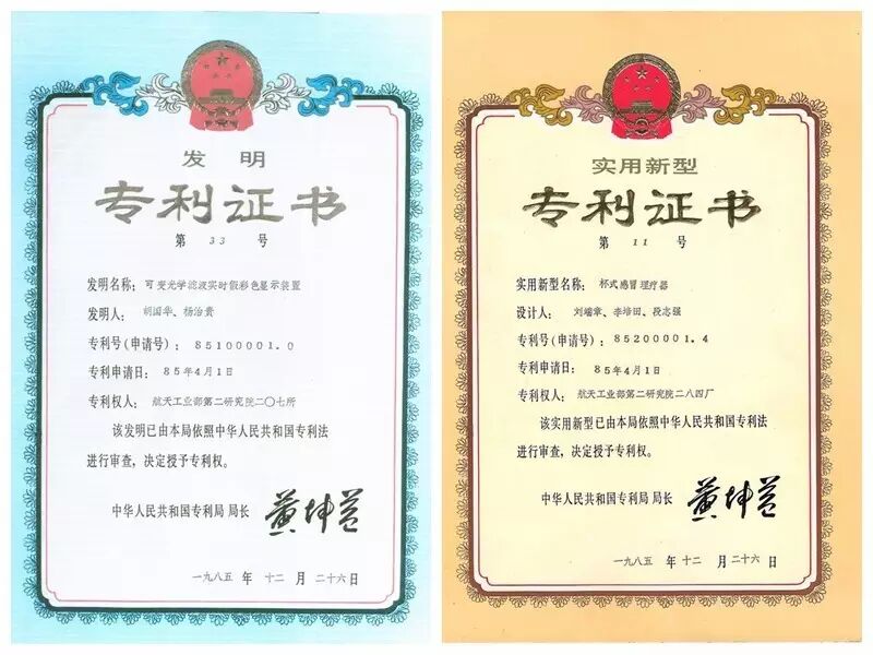 1985年12月,二院207所胡国华发明的“可变光学滤波实时假彩色显示方法和装置”获我国专利史上第一号发明专利,刘端章发明的“杯式感冒理疗器”获我国第一号实用新型专利。