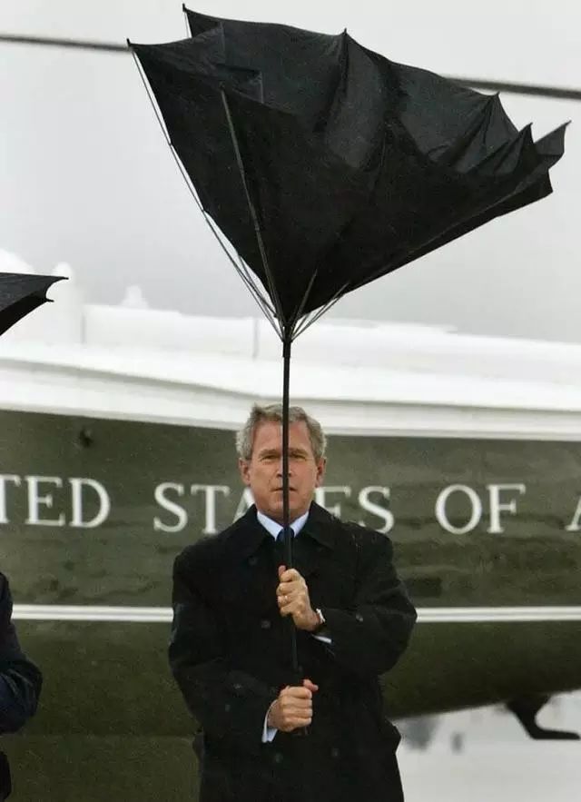 2005年6月1日,美国前总统布什在马里兰安德鲁斯空军基地,雨伞被被大风吹起。