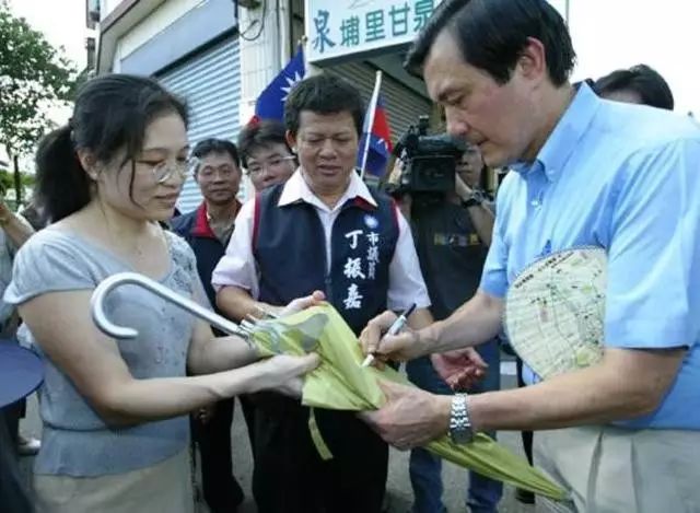 马英九在给一位女选举人签名时,对方的雨伞不辛刺到他的下身,虽然他面露痛苦,但仍然坚持为其签名,并没有骂街。