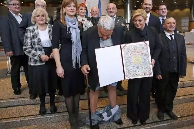 克罗地亚赫尔辛基人权委员会的主席伊凡与克罗地亚女总统合影时,裤子不慎掉了下来,伊凡马上将裤子提了起来,女总统全程镇静,从容应对尴尬时刻。