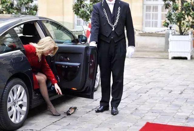 2012年12月5日,法国巴黎,丹麦首相托宁•施密特在爱丽舍宫前准备下车会见法国总统奥朗德时,高跟鞋竟然掉了,她不得不坐在车里弯腰伸手去捡鞋,非常狼狈。