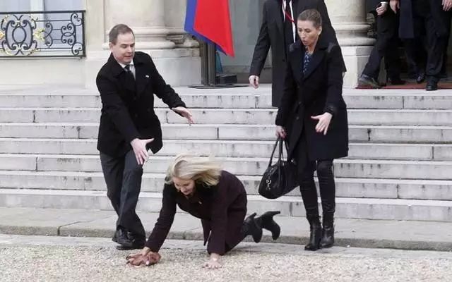 又是丹麦美女首相施密特,还是在在法国总统官邸爱丽舍宫,这次是摔了个嘴啃泥。