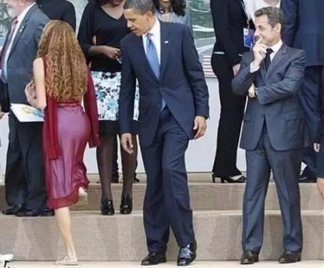 G8峰会上,奥巴马被一位金发美女的臀部吸引,旁边的法国前总统萨科齐露出了理解的笑容。