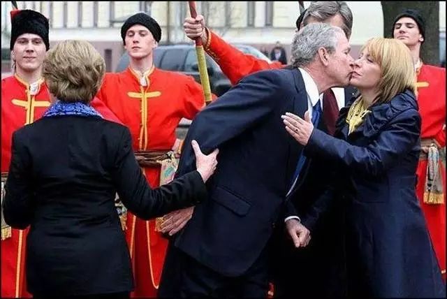 美国前总统布什到访乌克兰时,在为他举行的欢迎仪式上,老婆劳拉一把没拉住,布什“强吻”了乌克兰前总统尤先科的夫人。