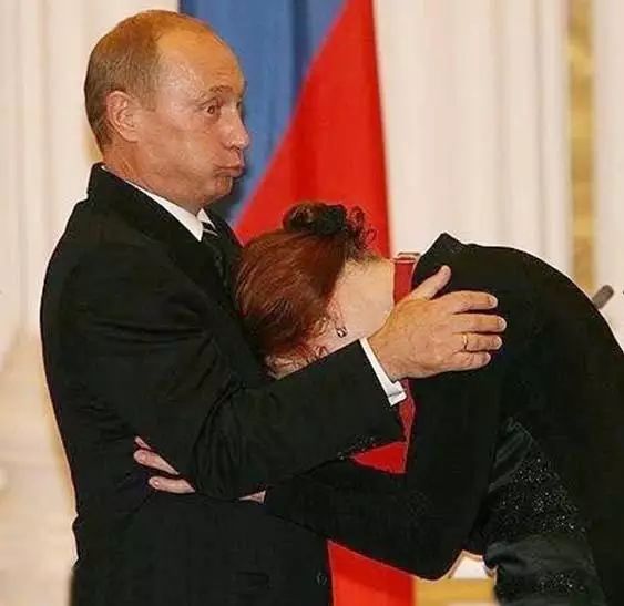 俄总统普京,在克里姆林宫给女演员尼娜尼古拉耶芙娜颁发祖国贡献三等奖章时,不料女演员突然搂住了丝毫没有防备的总统,让总统大为尴尬。