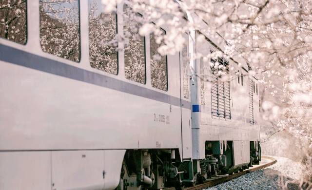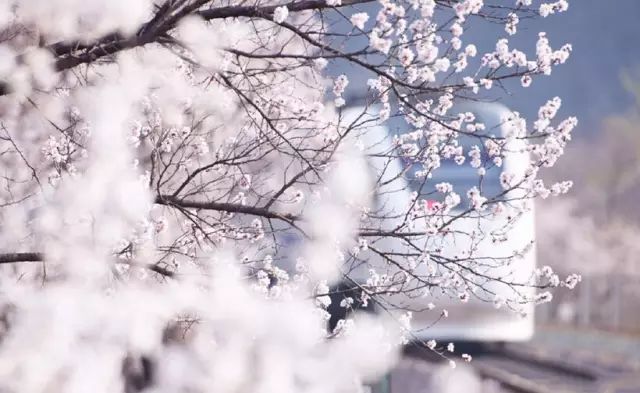 沿途枝桠花正盛,春光正好。等列车驶过,仿佛时间都再次静止一般。