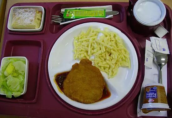 德国医院餐,包括油炸猪扒、空心粉、沙拉和蛋糕等
