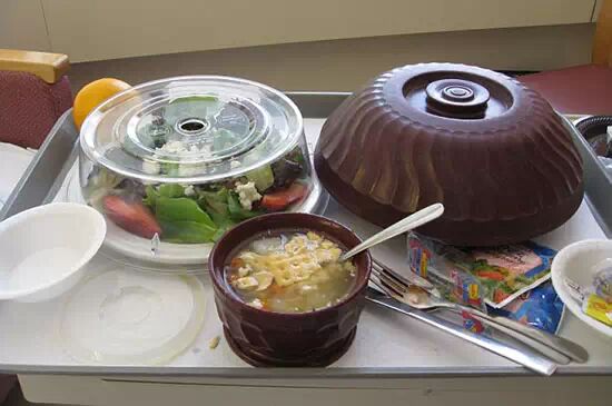美国马萨诸塞州医院餐,包括沙拉、鸡汤和饼干以及少量水果
