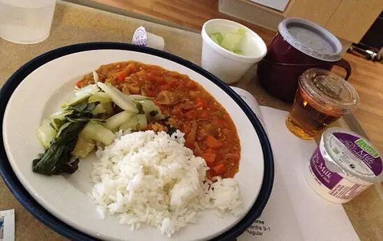 加拿大医院餐,包括酸甜口味的猪肉、小白菜、米饭和哈密瓜等