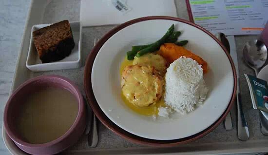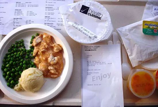 澳大利亚医院餐,包括南瓜汤、杏酱鸡肉、甜豌豆和土豆泥等