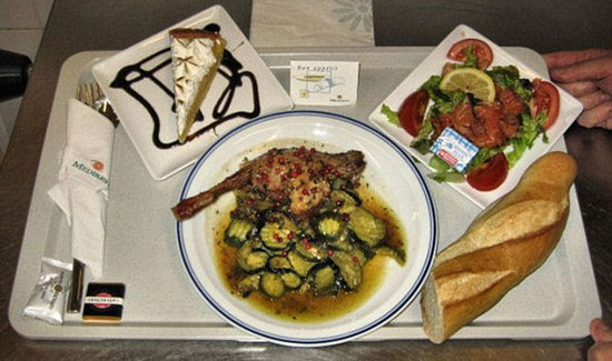 法国医院餐,包括熏三文鱼沙拉、鸡肉、面包棍和甜点等