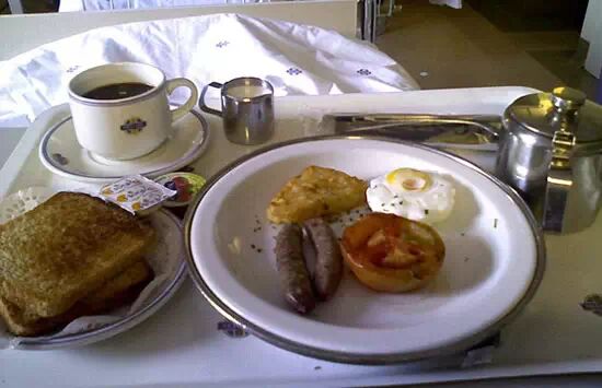 南非医院餐包括鸡蛋、香肠、西红柿、土豆饼、烤面包和茶水等