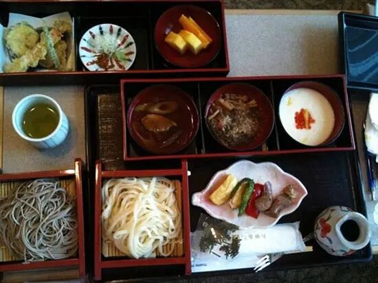 日本医院餐,包括新鲜蔬菜、肉、鱼,面条和天妇罗等