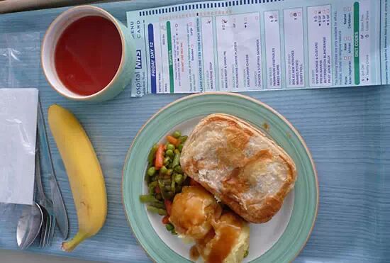 英国医院餐,包括西红柿蔬菜汤、牛肉、洋葱饼、蒸蔬菜和香蕉等